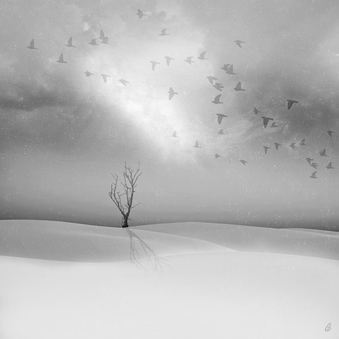Ici, le blanc n'est pas vide, il respire, il absorbe, il attend ..... Les ombres sont des présences lentes, le ciel pèse plus qu'il n'éclaire... L'arbre tien, fragile et juste... Les oiseaux trouent le silence. Le blanc devient espace mental. Un blanc habité... j'adore..