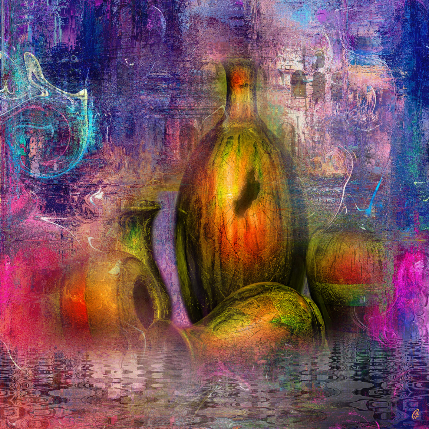 Une œuvre somptueuse, vibrante et envoûtante. Les couleurs fusionnent comme des flammes liquides, donnant vie aux vases. La matière semble respirer, entre mystère et lumière.